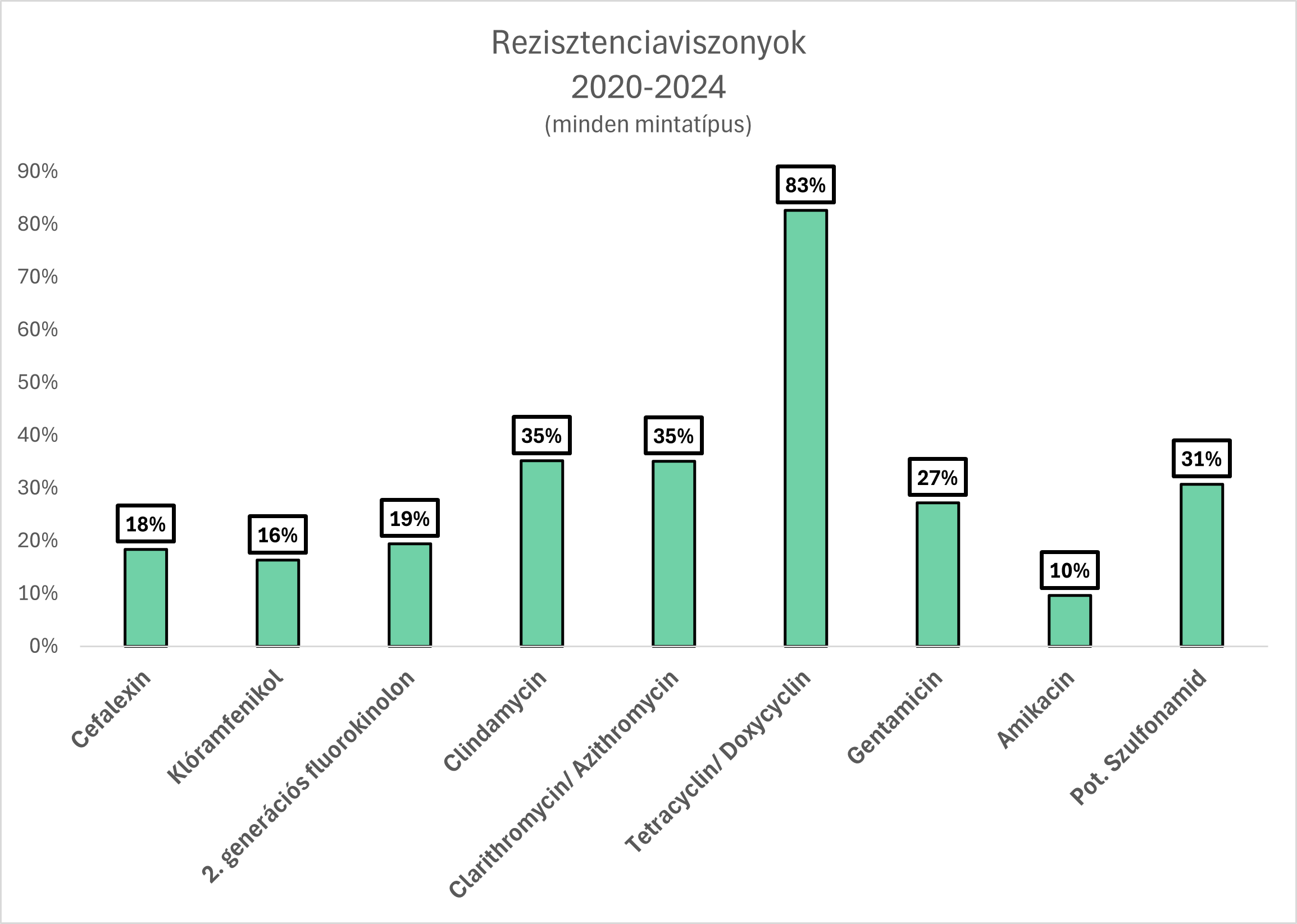Terápia tekintetében a Gram-pozitív aerob baktériumokra ható szereket kell figyelembe venni. Az elmúlt 5 teljes év (2020-2024) közel 9.000 db STI törzsről készített rezisztenciavizsgálatok alapján az alábbi rezisztencia-diagramot tudtuk megrajzolni: