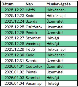 | • | | Hétköznapi és hétvégi napokon a megszokott munkarendben dolgozunk. |