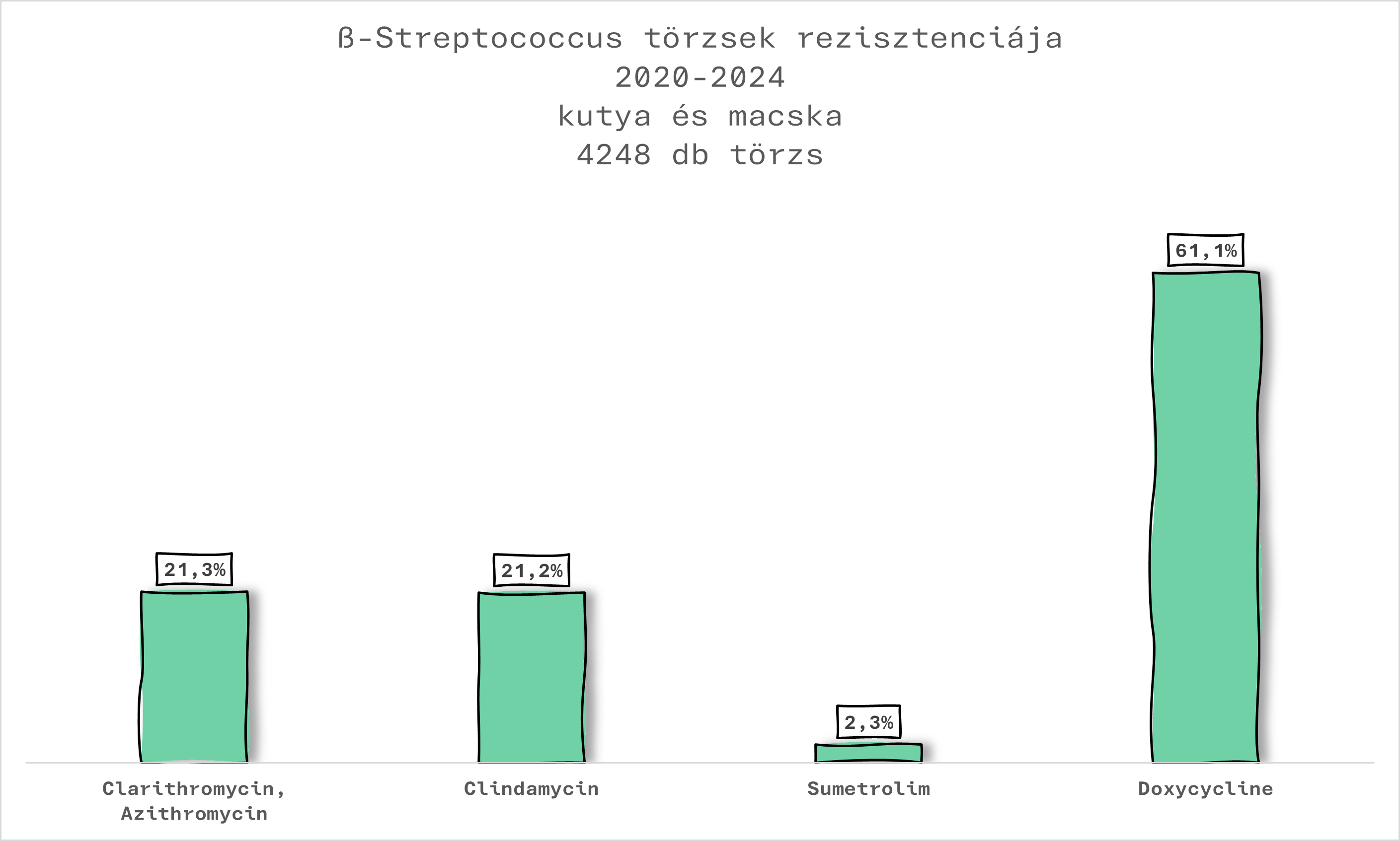 Ezzel szemben a kisállatgyógyászaban előforduló ß-hemolizáló Streptococcusok mindig érzékenyek penicillinre és amoxicillinre. Így a leggyakrabban választott és legjobban működő hatóanyagok ezek. Amennyiben farmakokinetikai okokból más szert kell választanunk, tartsuk szem előtt, hogy egyéb hatóanyagokra szórványosan előfordulhat rezisztencia, az alábbiak szerint: